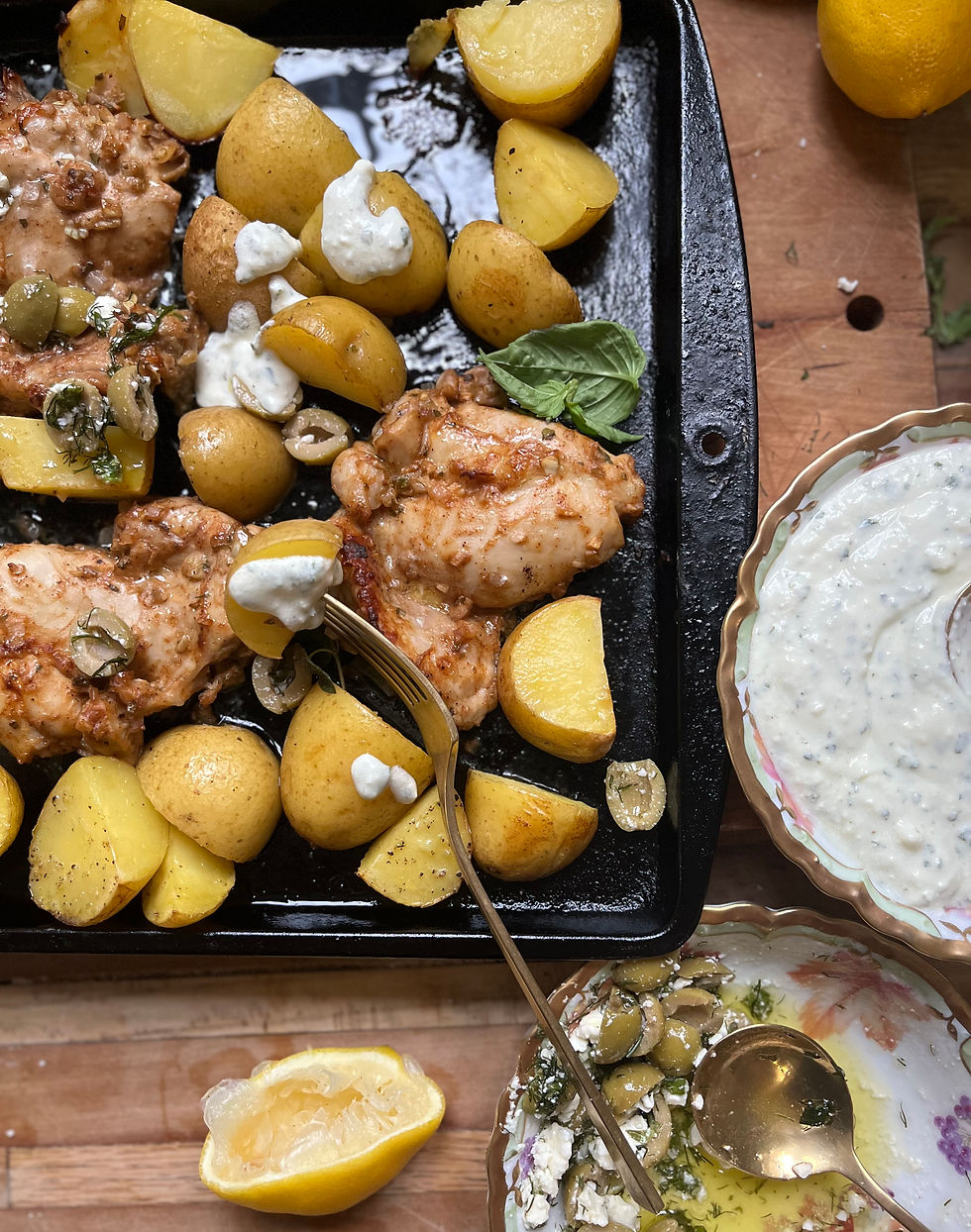 When chicken has cooked all the way through and potatoes are soft, top with feta sauce and olives. I served mine with lemon butter herb rice!